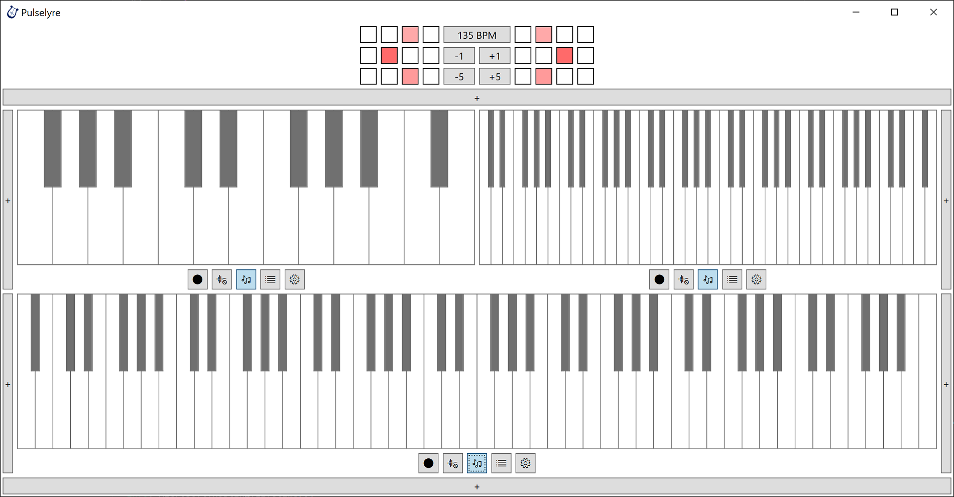Pulselyre is an application for recording and looping sequences of MIDI messages (mostly MIDI Note On/Off messages). It can record messages generated from the on-screen 'piano' buttons and keyboard bindings (from your QWERTY keyboard), or received from recognized external MIDI devices (such as USB MIDI controllers/keyboards). Pulselyre can send MIDI messages to any recognized MIDI device that can receive MIDI messages. Because Pulselyre only handles MIDI messages, it does not create or play any audio on its own.
